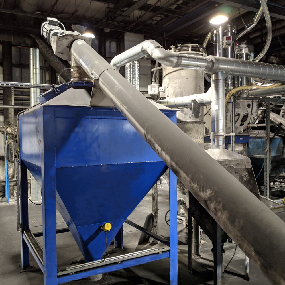 AJAX Supply An Inclined Screw Feeder to Hubron International a Manufacturer of Black Plastic Masterbatch and Conductive Compound.